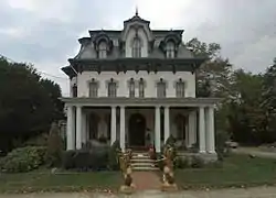 Built between 1882 and 1887, this historic structure is a three-story, three-bay by four-bay, brick dwelling that was designed in the Second Empire style. It features a "bell cast" mansard roof with patterned red and gray slate. Also located on the property are a contributing pony house and carriage house, both topped with elaborate cupolas.[2]
