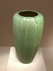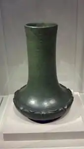 The company was founded in Revere, Massachusetts, by William Henry Grueby (Boston, 1867—New York, 1925), who had been inspired by the matte glazes on French pottery and the refined simplicity of Japanese ceramics he had seen at the World's Columbian Exposition in Chicago the previous year; and the architect-designer William Graves.[1] During its first years, the company produced glazed architectural terra cotta and faience tiles. The company initially focused on simple art pottery vases designed by George Prentiss Kendrick.[2] Beginning in 1897 and 1898, Grueby introduced matte glazes, including the matte cucumber green that became the company's hallmark.[3]