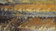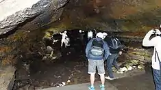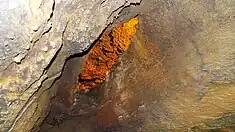 Along the cavern walls are speleological structures such as lateral benches, lava bridges, branching galleries, lava balls, stalactites, stalagmites, columns, spongy lavas, glaze and tree moulds.[1] Apart from several cracks, the walls and ceiling are multi-coloured (orange to yellowish) due to the basalt oxidization. There are also conical-shaped stalactites, secondary mineral deposits of silica and earthen deposits covering the walls and ceiling.[1] Many of the stalagmites are 25 centimetres (9.8 in) long with long sections of superimposed, soda-straw, conical ring-type tubes with pitted pockets.[1]