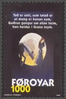 Guðrún has found Sigurd's horse Grani and has understood that Sigurd is dead. Illustration on a Faroese stamp by Anker Eli Petersen.