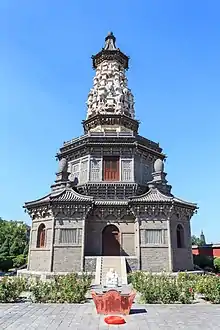 The Guanghui Temple Huata, also known as the Guanghui Temple Flower Pagoda and Guanghui Temple Multipurpose Pagoda,[1] is known as the Huata because its shape resembles a bouquet.[2] It originally belonged to the temple within the Guang Hui Temple, which was built during the Zheng Yuan period (785-804) of the Tang Dynasty.[3] There are many records about the date of the construction of Guanghui Temple Huata, including the theory that the pagoda was built during the reign of Emperor Gaozu Li Yuan of the Tang Dynasty.[4] Some say that the pagoda was built during the Sixteen Kingdoms period, repaired during the Tang Dynasty, destroyed during the Huangtong period of the Jin Dynasty, and rebuilt during the Dading period.[5] Others state that the pagoda was built during the Sui or Tang Dynasty.[6] Based on the shape and architectural style of the tower, the State Council of the People's Republic of China finally adopted the statement that the tower was rebuilt in the Jin Dynasty in the list of the first batch of national key cultural relics protection units published in 1961.[7] During the Ming and Qing dynasties, Guanghui Temple had a strong incense culture,[1] and the pagoda was restored twice during the Ming dynasty, once during the Zhengtong period.[4][5] In the late Qing Dynasty, Guanghui Temple gradually fell into disuse, its architectural ruins were covered by modern buildings, the only remaining temple being the Guanghui Temple Huata.[1][8] During the Republic of China period, all four sets of chambers under the Huata of Guanghui Temple were destroyed during the war, and only the main tower part remained.[7] From 1994 to 1999, the Guanghui Temple Huata was fully repaired and largely restored to its original appearance.[9] During the restoration process, the staff also found two inscriptions from the fourth year of Taiping Xingguo (979) and one from the tenth year of Xining (1071), among which the inscriptions from the fourth year of Taiping Xingguo can be identified as inscriptions by visitors according to their contents, and then the date of the construction of the tower can be determined to be no later than the Northern Song Dynasty.[7]