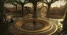The destruction of the Ravager ship the Eclector was handled by Weta Digital.[160] Weta Digital also handled Ego during his fight with Quill, utilizing a digital double of Russell for many of their shots. Weta also needed to create a digital double for David Hasselhoff for the moment when Ego shifts into Hasselhoff's guise. Guy Williams, Weta's visual effects supervisor, said, "We tried morphing to a live-action Hoff—but it did not hold up as well. The Kurt version looked better than the Hoff version ... and while we had built a very detailed Kurt digi-double ... we didn't want to go to the same level on the Hoff for just two shots. But in the end we did have to do a partial build digi-double of the Hoff. The reason we did the Kurt digi-double in the first place was to make sure all the effects stuck correctly to the body ... so we went with the approach of a full digi-double, the hair, the side of the face everything on Kurt. For the Hoff, we got pretty close, but it is not quite as detailed as for Kurt".[161] Additional work by Weta included the inside of Ego's planet, known as the Planet Hollow, which was inspired by the fractal art of Hal Tenny, who Gunn hired to help design Ego's environment.[158][162] Gunn added that there are "over a trillion polygons on Ego's planet," calling it "the biggest visual effect of all time. There's nothing even close to it".[162]