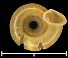 The most important shell characters for identification of Gudeodiscus messageri messageri include: slightly elevated spire, callus is not angled in the middle, apertural fold is always missing.[2] Other characteristics include: anterior lamella is normal (it is not dissolved into small denticles).[2] Lower parietal plica does not extend beyond the anterior lamella in the anterior direction.[2] The width of the shell is 12.75–18.5 mm.[2]