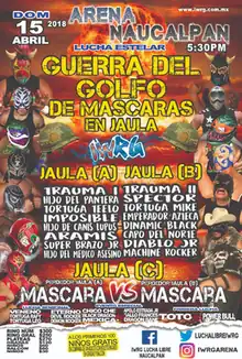 The Mexican wrestling promotion International Wrestling Revolution Group (IWRG; Sometimes referred to as Grupo Internacional Revolución in Spanish) has a long-standing history of holding major event focused on a multi-man steel cage match where the last wrestler left in the cage would be forced to either remove their wrestling mask or have their hair shaved off under Lucha de Apuestas, or "bet match", rules. In 2005 IWRG created a specific spring-time show promoting the steel cage match concept under the name Guerra del Golfo, or "Gulf War", referring to the Gulf of Mexico (not the Gulf War in the middle east).[2] The Guerra del Golfo shows featured two "qualifying" multi-man steel cage matches where the loser would later be forced to face off against each other in the main event of the show. In the final cage match the two wrestlers would wrestle where the loser would be forced to either unmask or, if they are not wearing a mask, have his hair shaved off. The use of the steel cage in three matches distinguishes the Guerra del Golfo event from other Steel cage matches held throughout the year such as the IWRG El Castillo del Terror'("The Tower of Terror"),[3][4] IWRG Guerra de Sexos ("War of the Sexes"),[5] or IWRG Prison Fatal ("Deadly Prison") shows.[6]