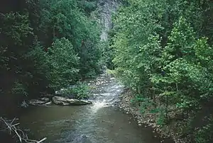The Guest River flows for nearly its entire length in Wise County. It rises in the north-central part of the county and flows initially south-southeastwardly to the city of Norton; then eastwardly to the town of Coeburn; then southeastwardly for the remainder of its course. It flows into the Clinch on the common boundary of Wise and Scott Counties. Portions of the river flow through the Jefferson National Forest.[2] The Guest River's lower course below Coeburn is paralleled by the Guest River Gorge Trail, formerly the Interstate Railroad.[3] The section of river which runs along the Guest River Trail contains multiple class 4 and 5 rapids.