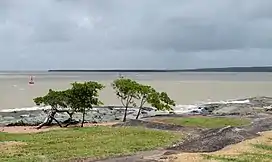 The Guianan marine ecoregion stretches along the middle of the northeast coast of South America, touching Venezuela, Guyana, Suriname and French Guiana. It extends about 200 miles offshore, with the warm Guianan Current moving east-to-west through the region. This current brings in fresh, turbid waters from the mouth of the Amazon River to the east. As the current exits the ecoregion to the west it contributes an estimated 70% of the waters of the Caribbean Sea.[2] A very large oil field has been recently discovered in the Guyana-Suriname Basin of the ecoregion.[3][4] The Guianan is one of two ecoregions (the other being the Amazonia marine ecoregion) in the North Brazil Shelf province,[5] a Large marine ecosystem (LME). The Guianan is thus part of the larger Tropical Atlantic realm. [6] [7] [8]