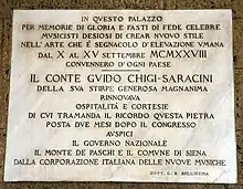 - ↑ The date of institution of the Concert hall and its associated concerts is so given in the SIUSA (Ministry of Culture) reference: "Il 22 novembre 1923 venne inaugurata un'apposita sala da concerto all'interno del palazzo insieme all'Istituzione concerti da camera che prese nome dal motto della famiglia Chigi Saracini (Micat in Vertice)." The Chigiana website, section "Storia: Il Conte Guido Chigi Saracini", however, says: "Nacque così l'idea di costruire il Salone dei Concerti con il grande organo, inaugurato il 22 novembre 1932, giorno di Santa Cecilia, dando vita alla stagione concertistica MICAT in VERTICE." (Read here). SIUSA (1923) seems to be correct (1932 was the date of formation of the Academy).