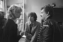 Filmset of the movie Kort Amerikaans in Leiden (The Netherlands), 13 March 1979. Left to right: Tingue Dongelmans, Derek de Lint, Guido Pieters