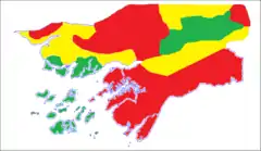 Map showing Portuguese-held (green), rebel-held (red), and disputed (yellow) areas in Portuguese Guinea in 1970.
