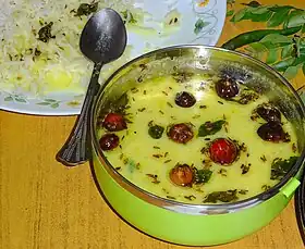 Gujarati kadhi (Gujarati: કઢી) is a Gujarati version of kadhi.[1] It is a very popular Gujarati dish made from buttermilk or dahi (yogurt) and gram flour.[2] Kadhi is an essential part of Gujarati cuisine.[3]