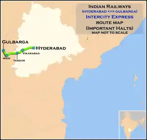 Gulbarga–Hyderabad Intercity Express is an intercity train of the Indian Railways connecting Gulbarga in Karnataka and Hyderabad Deccan of Telangana. It is currently being operated with 11307/11308 train numbers on a daily basis.[1][2]