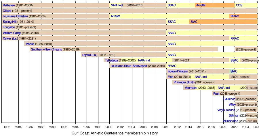- ↑ Southern–New Orleans (SUNO) suspended its athletic program after the 2018–19 school year; and rejoined the GCAC in the 2022–23 school year.