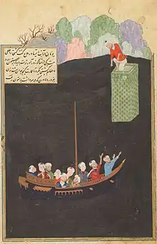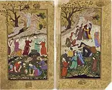 There follow the words illustrated in the Persian miniature, believed to be by the Mughal painter Govardhan, shown at the top of the article:[7]