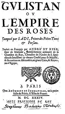 - ↑ texte, Saʿadī (1193-1292?) Auteur du (1634). Gulistan, ou L'empire des roses , composé par Sadi,... trad. en français par André Du Ryer,...