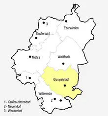 In 1680, with the fracturing of the Ernestine duchies, Gumpelstadt became part of the Principality of Saxe-Meiningen. It was first part of Amt Altenstein, in 1868 it became part of Meiningen county and in 1950 part of Bad Salzungen county. In 1955, Gumpelstadt had 1223 inhabitants.[2]