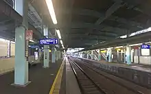 The station consists of two elevated opposed side platforms with the station building located underneath.