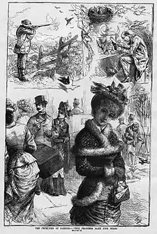 The most popular plumes came from various species of wading birds, known as "little snowies" for their snowy-white feathers; even more prized were the "nuptial plumes", grown during mating season and displayed by birds during courtship.[10] Poachers often stole into the densely populated rookeries, where they would shoot and then pluck the roosting birds clean, leaving their carcasses to rot. Unprotected eggs became easy prey for predators, as were newly hatched birds, who also starved or died from exposure. One ex-poacher would later write of the practice, "The heads and necks of the young birds were hanging out of the nests by the hundreds. I am done with bird hunting forever!"[11]