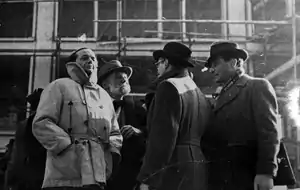 ![]() Auguste Perret surrounded by architects Pierre-Edouard Lambert, Guy Lagneau and Alexandre Persitz in Le Havre on 27 September 1947 | |