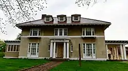 The Guy P. Gannett House stands on the west side of State Street (United States Route 201) in the city's Capitol Complex. It stands just north of The Blaine House, the official residence of the governor of Maine, and is owned by the state as part of a buffer around that property. It is a basically square 2+1⁄2-story wood-frame structure, with a hip roof that has deep eaves showing exposed rafter ends, stuccoed exterior walls, and a granite foundation. Single-story porches extend to the north and south, and a two-story ell extends to the rear. The front facade faces east, and is symmetrically arranged. It is three bays wide, with a single-story porch extending across the center bay. The main entrance is at the center, with flanking sidelight windows. The porch is supported by Tuscan columns, and has a metal balcony railing above. Windows in the side bays are three-part, with narrow side elements flanking larger central ones in a Palladian style.[2]