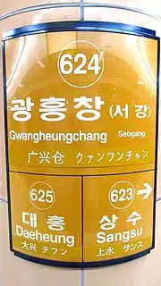 Gwangheungchang Station is a subway station on the Seoul Subway Line 6 in Mapo-gu, Seoul.[2][1] It is located close to the northern end of Seogang Bridge, which links Sinchon and Yeouido. Bamseom, located under the bridge on the Han River, is visible from here.