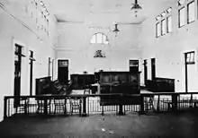 The court room is intact, apart from a new wall which creates a new entrance at the front of the building, and the addition of fluorescent lighting and new speakers. The walls are plastered with Keens marble cement to dado height, and capped with a plaster moulding, all now painted. Door and window architraves, a band mould under the sills and pilasters are of painted white plaster. The original furniture and cedar joinery remain intact. The ceiling comprises painted timber panels supported by decorative brackets with large Wunderlich ventilators in the central panels.[1]