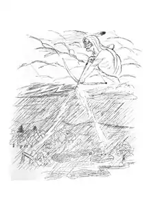 In Iroquois mythology, Hé-no descended to earth twice.[2] On the first occasion, Gunnodoyak, a young hero who was the servant of Hé-no and empowered with the spirit of thunder, was commanded to kill the Great Water Snake of the Great Lakes, enemy of mankind, but Gunnodoyak was swallowed by the serpent instead. Hé-no then slain the serpent at Lake Ontario with his flaming arrows shot from the sky, cut open its belly and resurrected Gunnodoyak, who was then taken to heaven.[1][4][6] Upon the serpent's death, its body broke into small pieces which formed the islands of the Great Lakes.[2] The indigenous people considered the violent waves of Lake Ontario to be the serpent moving in vengeance.[4] On the second occasion, Hé-no saved his people by slaying the Stone Giants of the west. The Stone Giants' shattered bodies became pebbles.[1][2] Hé-no is also credited with sending three Thunderers to earth every year to destroy evil.[1]