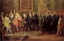 98. Collection du Mobilier national: Tapisserie de Lice, Histoire du Roi, Renouvellement de l’alliance avec les Suisses le 18/11/1663, d’après Charles Le Brun, Numéro d’inventaire GMTT-95-013