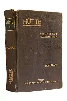 The Hütte - Das Ingenieurwissen (originally Des Ingenieurs Taschenbuch, stylized as "HÜTTE" and pronounced IPA: [ˈhʏtə]) is a reference work for engineers of various disciplines. It was compiled for the first time in 1857[2] by the Akademischer Verein Hütte (short Die Hütte, translating as "the hut") of the Königliches Gewerbe-Institut in Berlin, from which the association of German engineers Verein Deutscher Ingenieure (VDI) emerged. The authors were members of the association. The technical illustrations were created in woodcut technique by Otto Ebel. It is published in constantly revised editions to this day and is therefore the oldest German reference work still available today.[3]