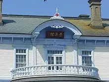 The Hōheikan is currently the only building used as a wedding hall among the Important Cultural Properties.[4] The building is also the oldest wooden hotel building in existence in Japan.[3] The architecture of the Hōheikan comprises a few styles. The whole building was constructed in the American style, but the balcony and its accompaniments at the front of the building was constructed in European style. The semicircle roof at the centre of the building has a Gegyo (懸魚) sculpture, a Japanese traditional fish sculpture usually seen at the roof of Japanese shrines and temples.[3] The colour Ultramarine blue, which was imported from Europe, is painted on the column and window frames.