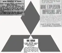 After the explosion, the owners of mine cut up hundreds of oranges and tossed them down the shaft thinking that the citrus would negate the poison gas fumes.[1] As the rescuers went down into the mine they "Each held a summer orange in their mouth and went down breathing only through their noses" under the same belief.[1] After a short while to prevent the fire from spreading underground and destroying valuable coal the mine's entrances were sealed to put out the fire but as a result, also killing anyone who survived the initial explosion underground.[3] As with most Japanese mines the wives worked with their husbands and an estimated 20% of those killed were women.[3]
