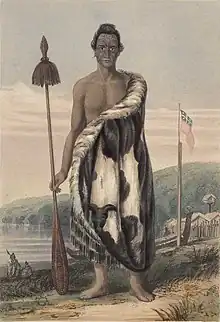 Te Puni belonged to the Ngāti Te Whiti and Ngāti Tawhirikura hapū of Te Ātiawa.[2] Born in Taranaki his mother was Te Puku and his father was the chief Rerewha-i-te-rangi.[1] He acquired the name 'Te Puni-kokopu' ('puni' for pool, 'kokopu' for fresh water fish) as a young man, when to escape an invading force attacking Rewarewa pa (located near to present-day New Plymouth) he and his father's younger brother Raua-ki-tua leapt from the pa down a cliff-face into the Waiwhakaiho River and swam to safety.[1]