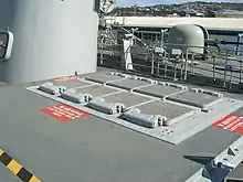 As designed, the main armament for the frigate is a 5-inch 54 calibre Mark 45 gun, supplemented by an eight-cell Mark 41 vertical launch system for RIM-7 Sea Sparrow, two 12.7-millimetre (0.50 in) machine guns, and two Mark 32 triple torpedo tube sets firing Mark 46 torpedoes.[13][19] They were also designed for but not with a close-in weapons system (a Phalanx CIWS installed shortly after the frigate's completion, supplemented by two Mini Typhoons from 2006 onwards), two quad-canister Harpoon missile launchers, and a second Mark 41 launcher (neither of which have been added to the New Zealand ships).[13][22][23] The New Zealand Anzacs initially operated with a Westland Wasp helicopter, which were later replaced by Kaman SH-2 Seasprites, then Kaman SH-2G Super Seasprite helicopters.[13][24]