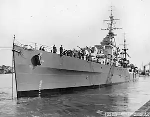 HMS Black Prince was a Dido-class light cruiser of the Royal Navy, of the Bellona subgroup. The cruiser was commissioned in 1943, and served during World War II on the Arctic convoys, during the Normandy landings, and as part of the British Pacific Fleet. In 1946, the cruiser was loaned to the Royal New Zealand Navy, becoming HMNZS Black Prince. The cruiser was docked for modernisation in 1947, but in April, her sailors walked off the ship as part of a series of mutinies in the RNZN. The shortage of manpower resulting from these mutinies meant that the modernisation had to be cancelled, and Black Prince was placed in reserve until 1953. She returned to service after refitting with simplified secondary armament with a single quad "pom pom" in Q position and eight Mk3 40mm Bofors guns. The ship was decommissioned again two years later, and returned to the Royal Navy in 1961. Black Prince did not re-enter service, and was towed from Auckland to Osaka for scrapping in 1962.