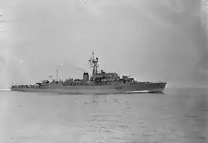 The Bay-class frigates were anti-aircraft versions of the Loch-class anti-submarine frigates intended for service in the Far East.[1] Carnarvon Bay displaced 1,600 long tons (1,600 t) at standard load and 2,420 long tons (2,460 t) at deep load. The ship had an overall length of 307 feet (93.6 m), a beam of 38 feet 7 inches (11.8 m) and a draught of 12 feet 9 inches (3.9 m).[2] She was powered by two vertical triple-expansion steam engines, each driving one shaft, using steam provided by two Admiralty three-drum boilers. The engines produced a total of 5,500 shaft horsepower (4,100 kW) and gave a maximum speed of 20 knots (37 km/h; 23 mph). Carnarvon Bay carried a maximum of 724 long tons (736 t) of fuel oil that gave her a range of 9,500 nautical miles (17,600 km; 10,900 mi) at 12 knots (22 km/h; 14 mph). The ship's complement was 157 officers and ratings.[1]