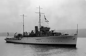 On 1 November 1933, the British Admiralty placed orders with Devonport Dockyard for two sloops, Grimsby and Leith,[2] the first of a new class named after Grimsby that was eventually to number eight ships built for the Royal Navy, four for the Royal Australian Navy and one for the Royal Indian Marine.[3][4] The Grimsby class, while based on the previous Shoreham class, was intended to be a more capable escort vessel than previous sloops, and carried a more powerful armament.[4][5]