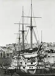 Hibernia was flagship of the British Mediterranean Fleet from 1816 until 1855, when she became the flagship for the Royal Navy's base at Malta and stationed in Grand Harbour. She remained in this role until she was sold in 1902.[1]