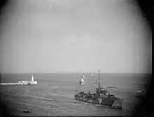 On 26 May 1940, the Royal Navy set Operation Dynamo in motion, to rescue trapped British troops from Dunkirk and the surrounding area.[8] On 27 May, Jaguar, together with Javelin and Grenade, was deployed to screen the evacuation operations from the North.[9] On 28 May, Jaguar and other destroyers rescued survivors from the sinking of SS Abukir.[6][10][11] Jaguar landed 370 troops picked up from the beaches of Bray-Dunes at Dover early on 29 May.[12][13] Later that day she was ordered to embark troops from Dunkirk harbour. Jaguar, Grenade and Gallant were attacked by German dive bombers as they arrived at Dunkirk at about noon, with Gallant damaged by a near miss and forced to turn back.Jaguar and Grenade berthed side by side on the East Pier at Dunkirk. She embarked about 1000 troops before leaving the harbour at about 15:50 hr, when she was attacked by dive bombers and near missed by four bombs, which severed a steam pipe, which disabled her engines and knocking out her steering. She was towed clear of a wreck by the destroyer Express, which along with the coaster Rika, took off Jaguar's troops. Later that day, Jaguar managed to restore power and returned to Dover under her own steam.[14][13][15]