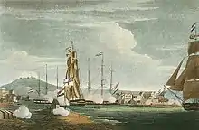 The expedition left on 24 December and arrived off Curaçao on 1 January 1807. The island was heavily defended by a chain of fortifications along the high ground, that also overlooked the harbour. Fort Amsterdam, had 60 guns guarding the entrance, and inside, the guns of a second large fort, Fort Republick, covered the entire anchorage. With such a small force at his disposal, Brisbane thought a peaceful solution unlikely and, in order that he might begin negotiations from a position of strength, sailed his ships straight into the harbour.[34]