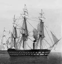 HMS Majestic was the second ship to bear the name. She was an 80-gun second rate ship of the line, built at Chatham Dockyard and launched on 1 December 1853. She spent 12 years on the stocks beforehand.[2] She was fitted with both sail and screw propulsion. She served in the Crimean War, and acted as part of Liverpool's harbour defences from 1860–66, during which time she was noted for blocking two ships commissioned by the American Confederacy from leaving Laird's Shipyard in Birkenhead.[1][3] She was eventually broken up in 1868 after 15 years in service.[2]