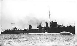 On commissioning, Porpoise joined her sister ships in the 4th Destroyer Flotilla, based at Portsmouth.[13][14] On the outbreak of the First World War, the 4th Flotilla, including Porpoise, became part of the Grand Fleet.[15][16] On 23 December 1915, Porpoise and the destroyer Morning Star were escorting a Russian icebreaker when forced to hove to near Fair Isle in a heavy gale. On 24 December, the 1st Cruiser Squadron, on patrol in the North Sea were ordered to search for the two destroyers, and the cruisers Hampshire and Donegal left Scapa Flow to join in the search. Porpoise reached the shelter of the Cromarty Firth on 25 December, with Morning Star following on 26 December, both destroyers having suffered extensive weather damage and flooding.[17] She was under refit on 24 April 1916, and so did not take part in the Grand Fleet's sortie in response to the German Bombardment of Yarmouth and Lowestoft.[18]