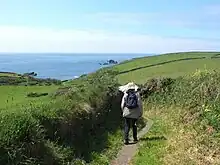Polpeor Cove, and Stag Rocks. The path leads down to Pistil Meadow which is thought by some to be the burial site of the 198 (right side of the path) when the Galley was lost on the nearby rocks