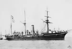Torch joined the Australian Station in February 1897, serving in New Zealand waters in 1898 and 1899.[3][4] She was part of the naval escort for the visit of the Duke and Duchess of York to Australia and New Zealand aboard the chartered Royal liner HMS Ophir during 1901.[3] After a refit, she recommissioned at Sydney on 29 November 1913. In July 1914 Torch, in company with the French cruiser Kersaint, was involved with a native uprising on the Island of Wala, Vanuatu. Five men were killed and four injured, and one native prisoner was captured.[5] In August 1914 she became part of the New Zealand Division of the Pacific Station.