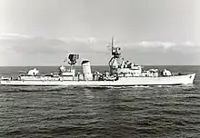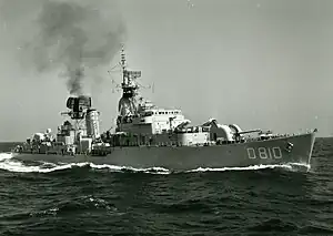 HNLMS Noord-Brabant (D810) (Dutch: Hr.Ms. Noord-Brabant) was a Holland-class anti-submarine destroyer of the Royal Netherlands Navy. The ship was from 1955 to 1974 in Dutch service. On 9 January 1974, HNLMS Noord-Brabant was rammed amidships by an English merchant ship. The damage was estimated to be expensive so the Royal Netherlands Navy decided to not repair the damage but instead decommission the ship earlier than planned. The ship's radio call sign was "PAIP".[2][3]