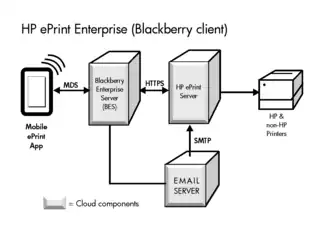 The method of sending data to the printer or MFP depends on the type of mobile device in use (i.e. Android, iOS, or BlackBerry). Android and iOS mobile devices use a direct connection to the HP ePrint Enterprise server. BlackBerry devices access the HP ePrint Enterprise network resources indirectly via the BlackBerry Enterprise Server (BES).