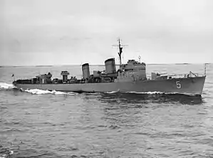 Göteborg was laid down by Götaverken in Gothenburg in 1934, launched on 14 October 1935 and commissioned on 30 October 1936.[7] The ship was named for the city, called Gothenburg in English, and allocated the pennant number J5. Initially serving with the Coastal Fleet, the destroyer was transferred to the Gothenburg Squadron on 27 August 1940.[8] On 8 April 1940, during the invasion of Norway, a ship claiming to be Göteborg was fired on by the British destroyer HMS Glowworm. The vessel was actually the German destroyer Z18 Hans Lüdemann, which escaped unscathed into the mist.[9]