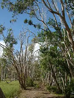 The start of the 1 kilometre (0.62 mi) causeway route is in a field at the north end of the metalled Habana Wharf Road. The causeway, marked by an avenue of paperbark (Melaleuca) trees, is visible to the left as Habana Wharf Road bends to the right towards a private residence.[1]