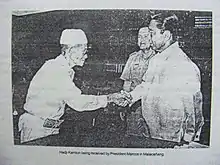 Kamlon's initial conviction was upheld and he was sentenced to life imprisonment, a condition Kamlon himself contested, claiming that his surrender was not entirely unconditional because there was "a promise of a parole". However, the Philippine government countered with the justification that Kamlon was not promised anything beyond his partial pardon. Since he had violated the conditions of his pardon, he was disqualified. The conditions included a monthly report from Kamlon to the Philippine Constabulary, his assistance to the surrender of rebels and firearms in the Sulu area, and his permission to be regularly visited by an authority from the Philippine government.[17] Among those who worked for his release was Nur Misuari, later chairman of the Moro National Liberation Front. For those who survived the uprising, and those who would follow the path of Moro rebellion, the aging Kamlon was viewed as a pioneer in fighting for independence and liberty. He was finally granted a pardon by President Ferdinand Marcos.[18]