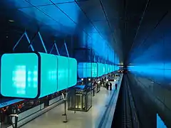 The station was designed by Munich-based architecture firm Raupach Architekten.[1] The design makes reference to the changing colors typical to the HafenCity, caused by reflections throughout the day by the wharf buildings' red brick and the ship hulls' iron and steel.
