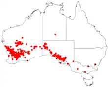 It is endemic to an area in the Wheatbelt, Mid West and Goldfields-Esperance regions of Western Australia from Geraldton in the west to Wiluna in the north to Lake Grace in the south and the Great Victoria Desert in the east extending into western parts of South Australia where it is found on sand-plains growing in sandy-clay, loam or clay soils often with gravel and quartz present.[2] It is usually part of mallee woodland and shrubland communities.[3]