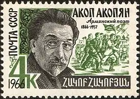 Hakob Mnatsakani Hakobian (Armenian: Հակոբ Մնացականի Հակոբյան; often transliterated from Russian as Akop Akopian; 29 May 1866 – 13 November 1937) was a Soviet Armenian poet. He was regarded as the founder of Armenian proletarian poetry. Awarded with the titles People's Poet of Armenia and People's Poet of Georgia.[1] He was considered the "Armenian Maxim Gorky" by the Bolshevik press.[2]